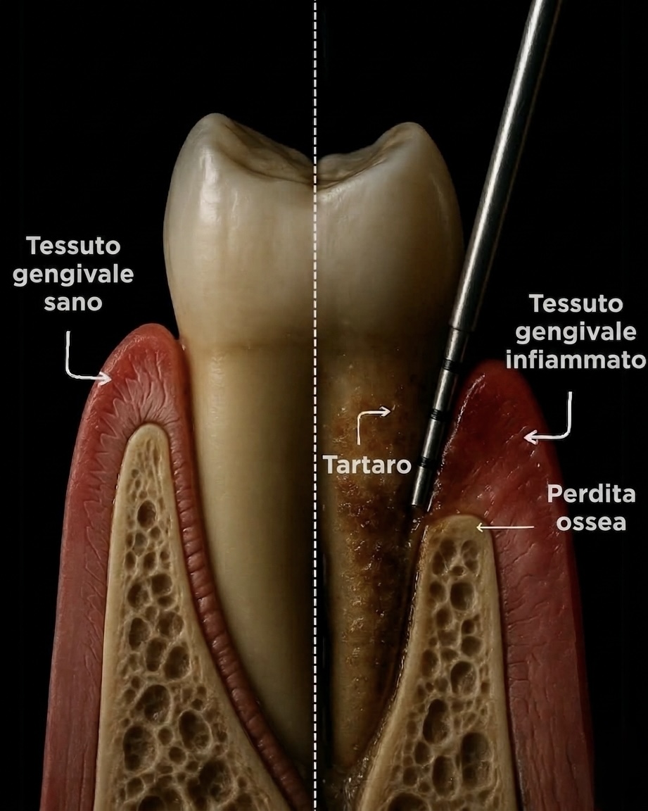 Il paradosso del dolore: Le tasche parodontali raramente fanno male. Puoi avere una tasca di 8 mm (gravissima) e non sentire nulla finché il dente non inizia a muoversi. Il "silenzio" della tasca è la sua arma più letale.